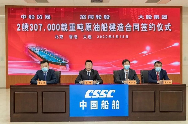 ????5月18日,中國(guó)船舶集團(tuán)旗下大船集團(tuán)、中船貿(mào)易與招商局集團(tuán)旗下招商輪船在北京、大連、香港三地以“云簽約”方式簽署2艘30.7萬(wàn)載重噸原油船建造合同。中國(guó)船舶集團(tuán)副總經(jīng)理孫偉、招商局集團(tuán)副總經(jīng)理王宏、招商輪船董事長(zhǎng)謝春林出席簽約儀式,中船貿(mào)易董事長(zhǎng)李洪濤、大船集團(tuán)總經(jīng)理?xiàng)钪局?、招商輪船總?jīng)理王永新代表各方在建造合同上簽字。